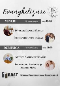 11 Februarie – 15 Februarie 2026 ✨ Te invităm la Evanghelizare! 📅 11–15 februarie 2026 | 🕕 ora 18:00📍 Biserica...